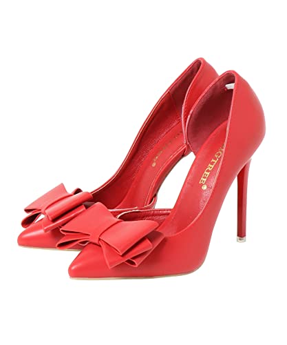 大きめのリボンのモチーフがつま先部分に付いているピンヒールはいかがですか。柔らかなPUレザーが使われています。