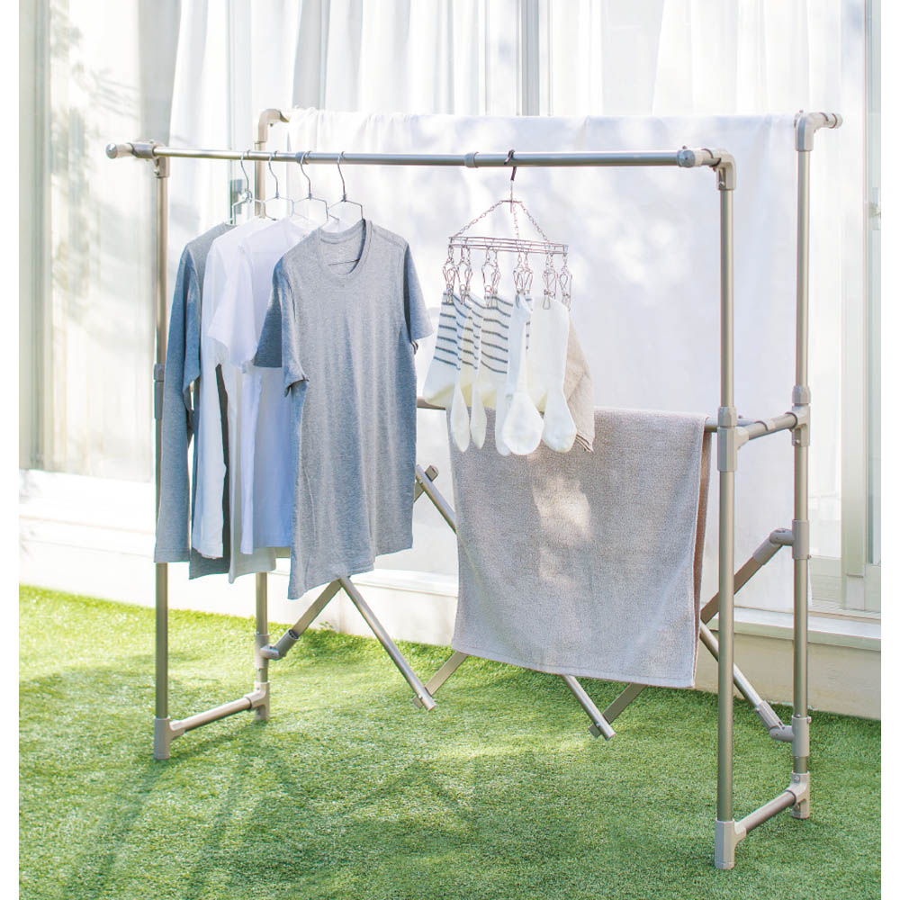 安定性が良く室内外で使える物干し台です。伸縮タイプだから、洗濯物の量に合わせてサイズを調整でき便利に使えておすすめです。二段式で風通しも良く良く乾いていいと思います。