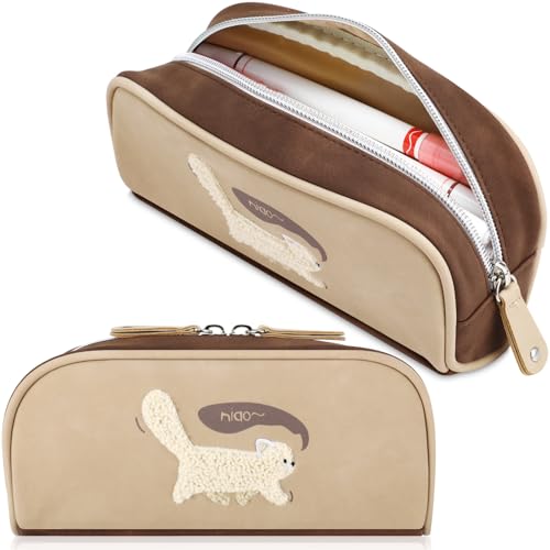 こちらのペンケースはいかがですか。本体は革仕様になっていて、かわいいネコの刺繍入りです。たくさんの文房具が入るので、これ一つでOK。女子高校生の必須アイテムです。通学カバンの中に入れてもかさばらないのも良い一品ですよ。