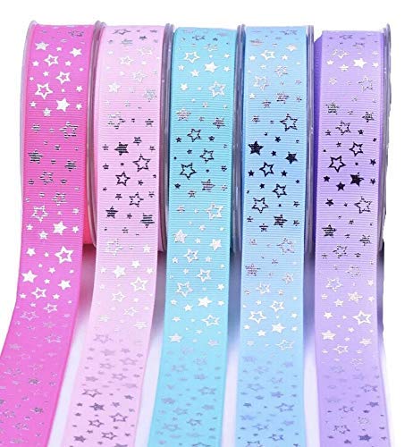 こちらリボン5色セットです。紫というかラベンダー色が入っていますがいかがでしょう?各2メートルあるのでいくつもつけたり、結び方を工夫したり、アレンジを楽しめそうですね。無地でなくキラキラの星がデザインされているところも、工夫があっていいですね。