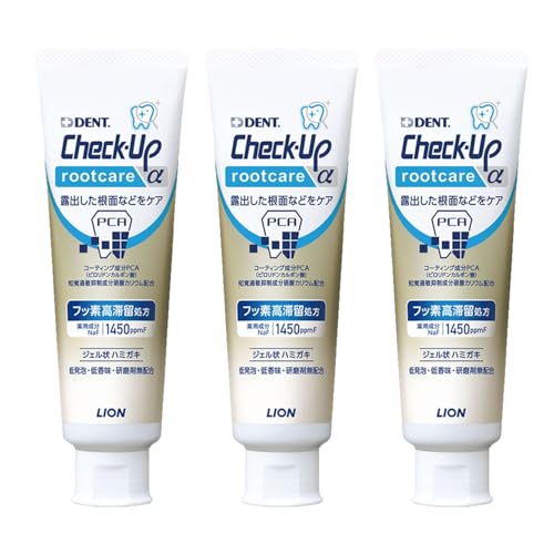ライオンの歯磨き粉、チェックアップ ルートケア アルファです。フッ化ナトリウム配合、フッ素が歯面と歯の根元のむし歯を予防してコーティング剤PCAが露出した歯の根元の表面のコラーゲンをコーティングし、歯の根のむし歯予防ができます。有効成分 KNO3配合で、知覚過敏の症状を緩和し、塩化セチルピリジニウムが細菌を殺菌し、歯肉炎や口臭を予防します。研磨剤無配合のジェルタイプだから少量洗口ができます。