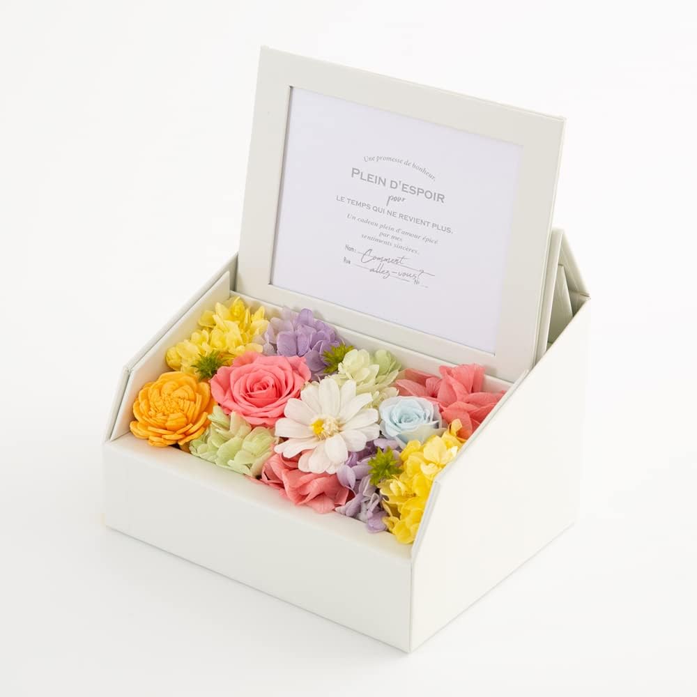 ハピネスとエスプリピンク、ブライトオレンジの3種類あり、どれもでデザインが良いです!花面は斜め立体的にアレンジされている事により、正面からしっかりと写真と花を見られます。幅約15cm×奥行約12cm×高さ約10cm(開けた場合約18.5cm)と手のひらサイズな所もポイントです!