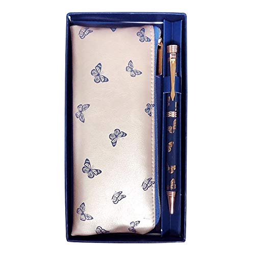 ブルーの ちょうちょのデザインでおしゃれです黒いインクボールペンとペンケースのセットで便利ですボックスに入っていて贈り物に最適です