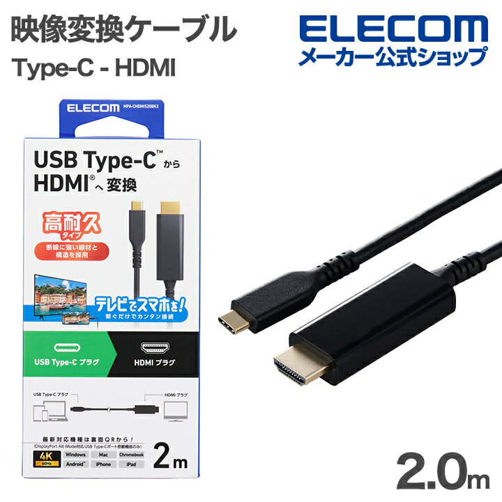 やはりここは、信頼できるエレコムで。 エレコムの映像変換ケーブル(商品番号:MPA-CHDMIS20BK3)、ケーブル長は2.0m、一方の端子はUSB-Tyape C、もう一方の端子はHDMI規格です。